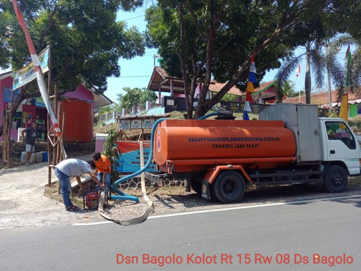 KALIPUCANG – Dinas Pemadam Kebakaran dan Penanggulangan Bencana (DPKPB) Kabupaten Pangandaran melalui Bidang Logistik, Rehabilitasi dan Rekonstruksi melaksanakan distribusi air bersih dengan menurunkan 1 unit mobil tangki air menuju 2 Dusun di Desa Bagolo Kecamatan Kalipucang yakni, Dusun Bagolo Kolot RT. 15, 16 RW 08 jumlah KK 60 Jiwa 190, sebanyak 2500 liter dan Dusun Sukasirna RT 04 RW 01 jumlah KK 40 Jiwa 140 sebanyak 2500 liter.