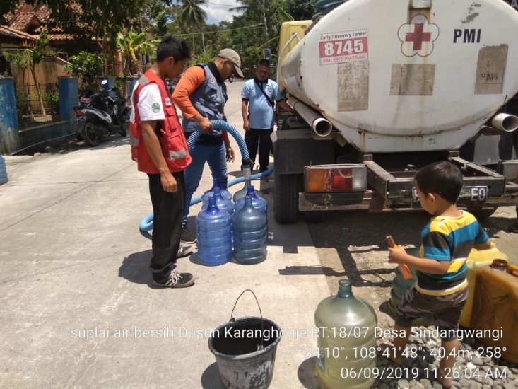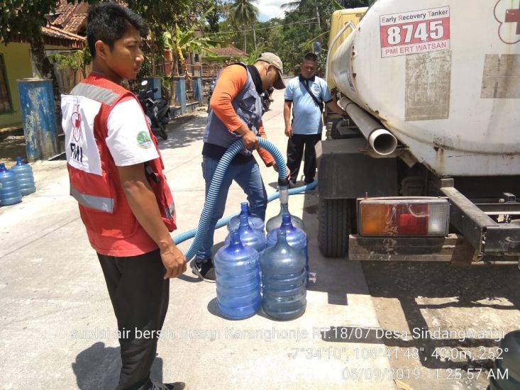 Padaherang — (6/9) BPBD KABUPATEN PANGANDARAN Melalui Bidang DARLOG RR Berkolaborasi Dengan PMI Kabupaten Pangandaran Melaksanakan Suplai Air Bersih Sebanyak 5.000 Liter Untuk Masyarakat terdampak Kekeringan Di Desa Sindangwangi Dusun Karanghonje Rt 17 Rw 07 Pemanfaat sebanyak 42 kk 153 Jiwa dan Rt 18 Rw 07 Pemanfaatan sebanyak 46 kk 167 Jiwa Kecamatan Padaherang Kabupaten Pangandaran. Masyarakat Pangandaran sudah semakin kekurangan air bersih khususnya di Desa Sindangwangi Dusun Karanghonje Kecamatan Padaherang Kabupaten Pangandaran.
