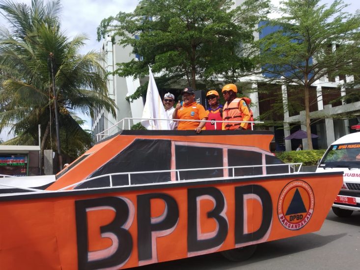 Pangandaran—(03/11) Dalam rangka memperingati hari jadi Kabupaten Pangandaran yang ke-7, siang ini Badan Penanggulangan Bencana Daerah (BPBD) Kabupaten Pangandaran ikut berpatisipasi mengikuti kegiatan Karnaval Budaya Milangkala Ke-7 Kabupaten Pangandaran yang dilaksanakan di Boulevard atau Pangandaran Sunset. Karnaval tersebut diikuti oleh semua unsur seperti SKPD, Pemerintahan Desa, BUMN, BUMD, Stakeholder Kepariwisataan, Perbankan, Komunitas, Pelajar dan Masyarakat.