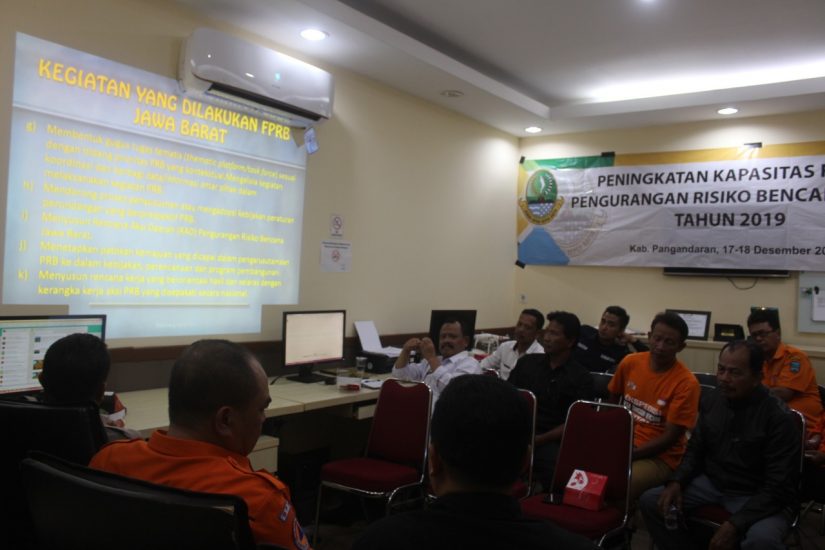 Parigi – Badan Penanggulangan Bencana Daerah (BPBD) Provinsi Jawa Barat menyelenggarakan kegiatan Peningkatan Kapasitas Forum Pengurangan Risiko Bencana (FPRB) yang bertempat di Ruangan Pusdalops PB Pangandaran yang dilaksanakan pagi ini Rabu, 18 Desember 2019. Hadir juga Kepala Pelaksana BPBD Kabupaten Pangandaran Dr. Drs. H. Nana Ruhena, MM.,