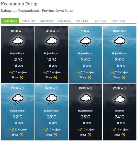 Peringatan dini : Waspada potensi hujan yang dapat di sertai kilat/petir dan angin kencang di wilayah Kab. Bogor, Kota Bogor, Kab. Karawang, Kota Depok, Kab. Bekasi, Kota Bekasi, Kab. Purwakarta, Kab. Subang, Kab. Sukabumi, Kota Sukabumi, Kab. Cianjur, Kab. Bandung Barat, Kota Bandung, Kab. Bandung, Kota Cimahi, Kab. Garut, Kab. Tasikmalaya, Kab. Ciamis, Kota Banjar, Kab. Pangandaran dan sekitarnya. Pada periode siang/sore hari hingga malam hari.