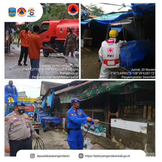 Untuk memutus rantai penularan COVID-19 di Kabupaten Pangandaran, Jumat (20/11/2020) Tim gabungan telah melaksanakan Penyemprotan desinfektan di Area Pasar Pananjung Pangandaran.
