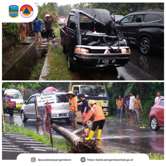 6. Kronologis : hari Jum’at tanggal 29 Januari 2021 terjadi angin kencang sehingga menyebabkan pohon kelapa tumbang menimpa mobil yang baru pulang dari ciamis mengantarkan anaknnya Ibu Eti kuliah. Dalam kejadian tersebut mengakibatkan 1 orang mengalami luka ringan dan di bawa ke puskesmas parigi An. Eti warga Desa Margacinta Cijulang.