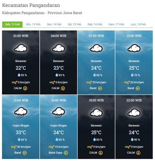 Peringatan dini : Waspada potensi hujan yang dapat disertai kilat/petir dan angin kencang pada siang hingga malam hari di Kab Pangandaran