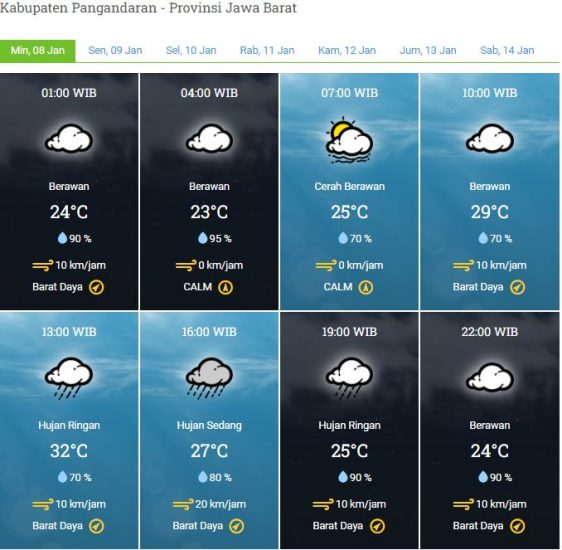 Peringatan Dini : Waspada potensi hujan sedang hingga lebat yang dapat disertai kilat/petir dan angin kencang pada waktu antara menjelang siang hingga malam hari di sebagian wilayah Kab Pangandaran.