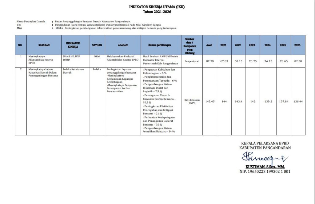 INDIKATOR KINERJA UTAMA (IKU) Tahun 2021-2026 BPBD Kabupaten Pangandaran