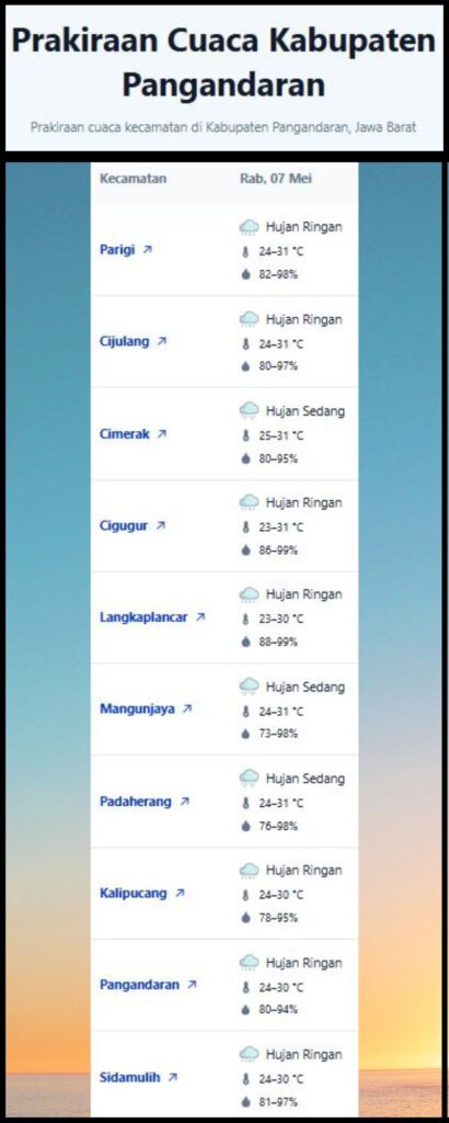 Laporan Harian & Prakiraan Cuaca Kabupaten Pangandaran – Rabu, 7 Mei 2025.