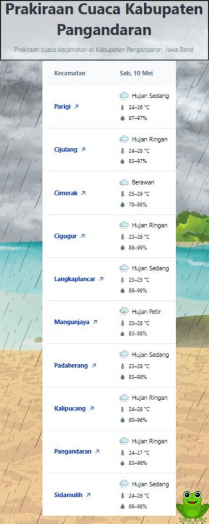 LAPORAN HARIAN PUSDALOPS PB KAB. PANGANDARAN BADAN PENANGGULANGAN BENCANA DAERAH KAB. PANGANDARAN A. Waktu : Sabtu, 10 Mei 2025 Pukul 06.20 WIB. B. Kejadian Bencana : NIHIL C. Prakiraan Cuaca : Pagi : Cerah Berawan Siang : Hujan Ringan Malam : Berawan Dini Hari : Cerah Berawan Suhu : 24°C – 31°C Kelembaban : 63% […]