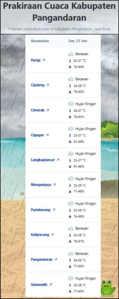 LAPORAN HARIAN PUSDALOPS PB KAB. PANGANDARAN BADAN PENANGGULANGAN BENCANA DAERAH KAB. PANGANDARAN A. Waktu : Minggu, 22 Juni 2025 Pukul 06.50 WIB. B. Kejadian Bencana : NIHIL C. Prakiraan Cuaca : Pagi : Cerah Berawan – Hujan Ringan Siang : Berawan Malam : Hujan Ringan Dini Hari : Hujan Ringan Suhu : 22°C – 29°C […]