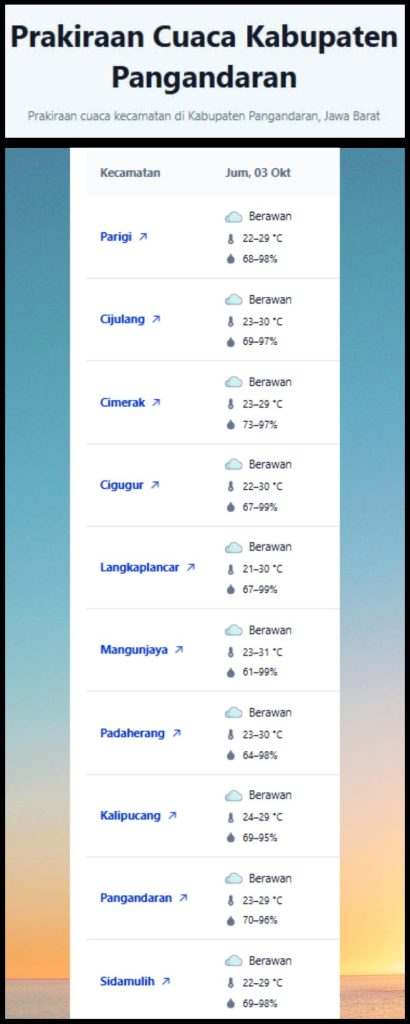 LAPORAN HARIAN PUSDALOPS PB KAB. PANGANDARAN BADAN PENANGGULANGAN BENCANA DAERAH KAB. PANGANDARAN A. Waktu : Jum’at, 03 Oktober 2025. Pukul 06.00 WIB. B. Kejadian Bencana : NIHIL C. Prakiraan Cuaca : Pagi : Hujan Ringan Siang : Cerah Malam : Berawan Dini Hari : Hujan Ringan – Berawan Suhu : 22°C – 29°C Kelembaban : […]