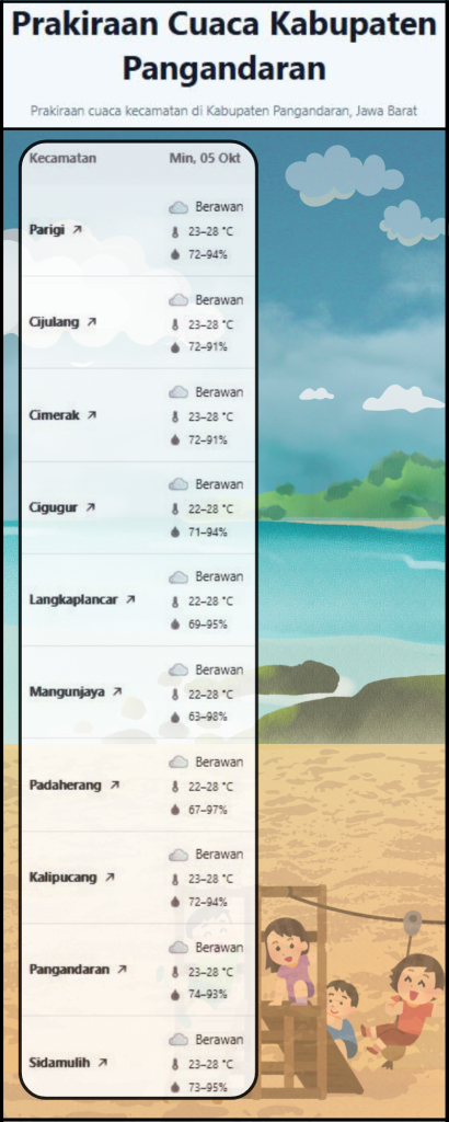 LAPORAN HARIAN PUSDALOPS PB KAB. PANGANDARAN BADAN PENANGGULANGAN BENCANA DAERAH KAB. PANGANDARAN A. Waktu : Minggu, 5 Oktober 2025 Pukul 06.00 WIB. B. Kejadian Bencana : – NIHIL C. Prakiraan Cuaca : Pagi : Berawan Siang : Berawan Malam : Berawan Dini Hari : Berawan Suhu : 23°C – 28°C Kelembaban : […]