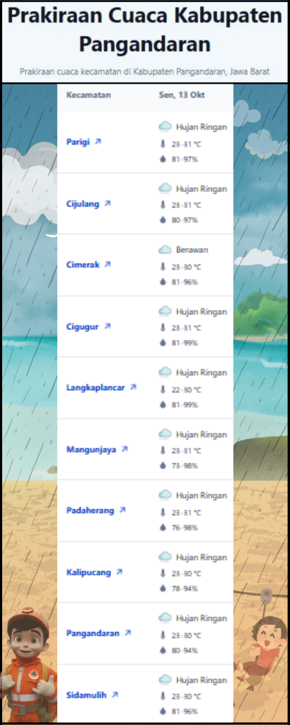 LAPORAN HARIAN PUSDALOPS PB KAB. PANGANDARAN BADAN PENANGGULANGAN BENCANA DAERAH KAB. PANGANDARAN A. Waktu : Senin, 13 Oktober 2025. Pukul 06.00 WIB. B. Kejadian Bencana : Nihil C. prakiraan Cuaca : Pagi : Hujan Ringan Siang : Berawan Tebal Malam : Berawan Tebal Dini Hari : Hujan Ringan Suhu : 26°C – 28°C Kelembaban : […]