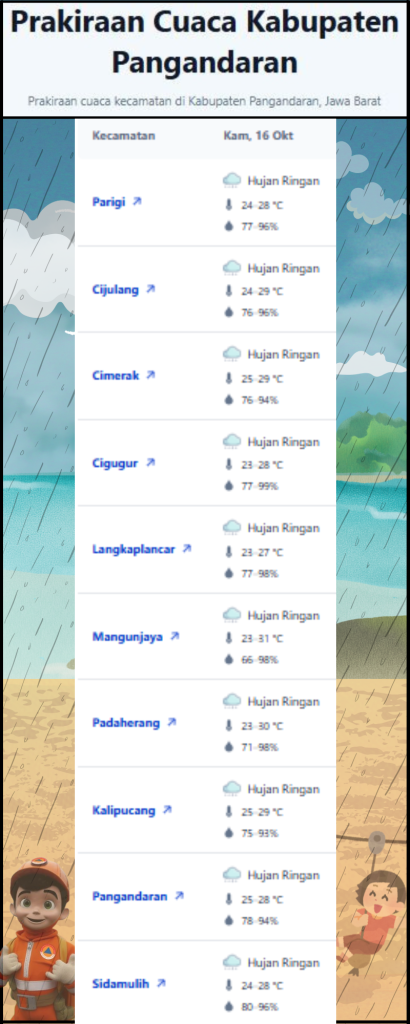 LAPORAN HARIAN PUSDALOPS PB KAB. PANGANDARAN BADAN PENANGGULANGAN BENCANA DAERAH KAB. PANGANDARAN A. Waktu : Kamis, 16 Oktober 2025. Pukul 07.00 WIB. B. Kejadian Bencana : Nihil C. Prakiraan Cuaca : Pagi : Hujan Ringan Siang : Cerah Berawan – Hujan Ringan Malam : Hujan Ringan Dini Hari : Hujan Ringan Suhu : 26°C – […]