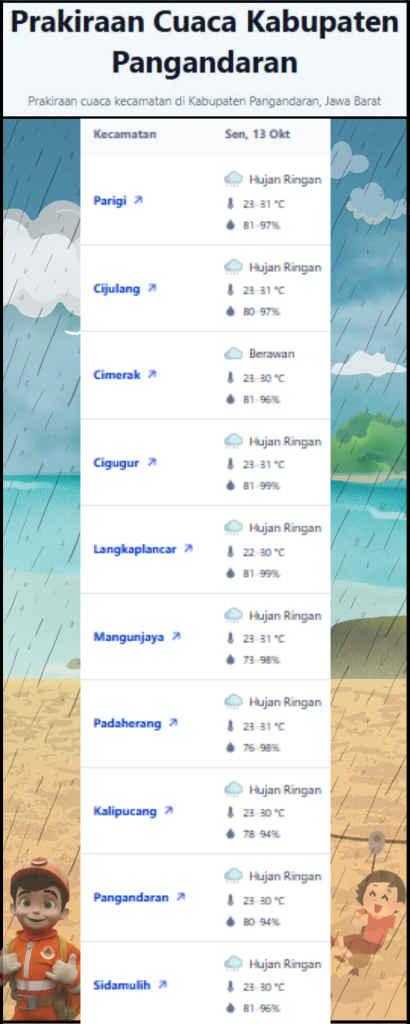 LAPORAN HARIAN PUSDALOPS PB KAB. PANGANDARAN BADAN PENANGGULANGAN BENCANA DAERAH KAB. PANGANDARAN A. Waktu : Minggu, 19 Oktober 2025. Pukul 07.00 WIB. B. Kejadian Bencana : Nihil C. prakiraan Cuaca : Pagi : Udara Kabur Siang : Hujan Ringan Malam : Hujan Ringan – Berawan Tebal Dini Hari : Udara Kabur Suhu : 25°C – […]