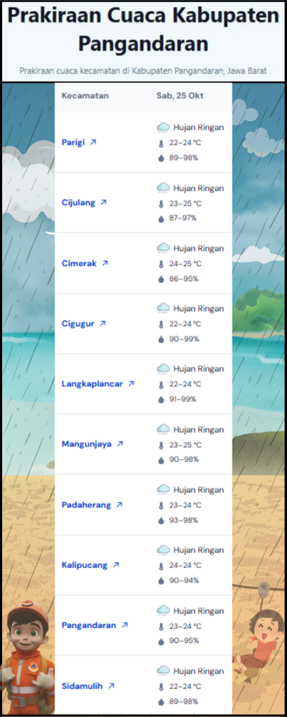 LAPORAN HARIAN PUSDALOPS PB KAB. PANGANDARAN BADAN PENANGGULANGAN BENCANA DAERAH KAB. PANGANDARAN A. Waktu : Sabtu, 25 Oktober 2025. Pukul 07.00 WIB. B. Kejadian Bencana : Nihil C. Prakiraan Cuaca : Pagi : Hujan Ringan Siang : Hujan Ringan Malam : Hujan Ringan – Berawan Tebal Dini Hari : Hujan Ringan Suhu : 25°C – […]