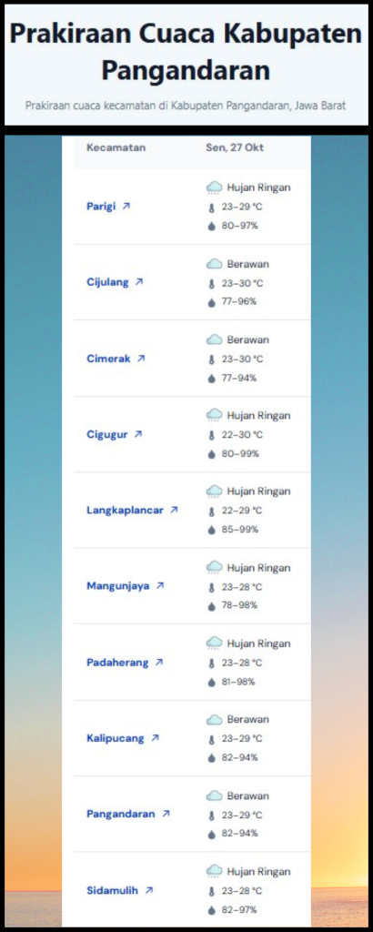 LAPORAN HARIAN PUSDALOPS PB KAB. PANGANDARAN BADAN PENANGGULANGAN BENCANA DAERAH KAB. PANGANDARAN A. Waktu : Senin, 27 Oktober 2025. Pukul 07.00 WIB. B. Kejadian Bencana : NIHIL C. prakiraan Cuaca : Pagi : Berawan – Hujan Ringan Siang : Hujan Sedang – Berawan Malam : Berawan Dini Hari : Hujan Ringan Suhu : 21°C – […]