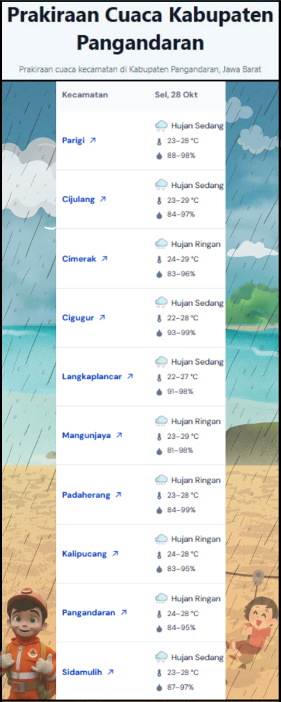 LAPORAN HARIAN PUSDALOPS PB KAB. PANGANDARAN BADAN PENANGGULANGAN BENCANA DAERAH KAB. PANGANDARAN A. Waktu : Selasa, 28 Oktober 2025. Pukul 07.00 WIB. B. Kejadian Bencana : Nihil C. Prakiraan Cuaca : Pagi : Hujan Ringan Siang : Udara Kabur – Berawan Tebal Malam : Hujan Ringan Dini Hari : Berawan Tebal Suhu : 25°C – […]