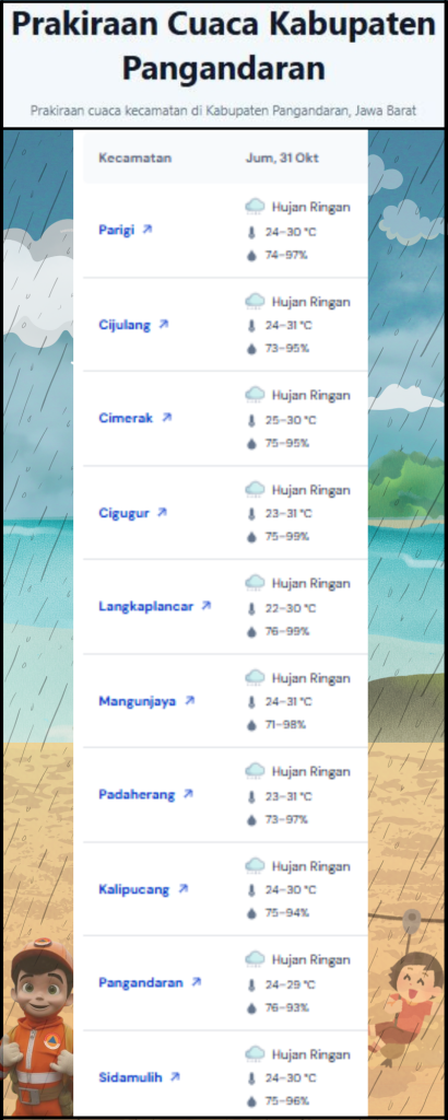 LAPORAN HARIAN PUSDALOPS PB KAB. PANGANDARAN BADAN PENANGGULANGAN BENCANA DAERAH KAB. PANGANDARAN A. Waktu : Jum’at, 31 Oktober 2025. Pukul 07.00 WIB. B. Kejadian Bencana : Nihil C. Prakiraan Cuaca : Pagi : Berawan Tebal – Hujan Ringan Siang : Hujan Ringan Malam : Hujan Ringan – Berawan Tebal Dini Hari : Hujan Ringan – […]