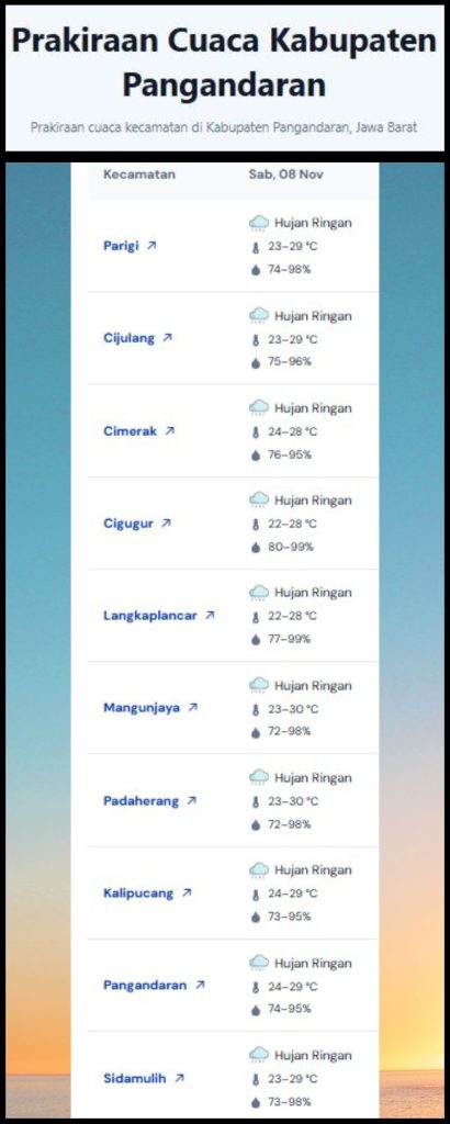 LAPORAN HARIAN PUSDALOPS PB KAB. PANGANDARAN BADAN PENANGGULANGAN BENCANA DAERAH KAB. PANGANDARAN A. Waktu : Sabtu, 08 November 2025. Pukul 07.00 WIB. B. Kejadian Bencana : NIHIL C. prakiraan Cuaca : Pagi : Berawan – Hujan Ringan Siang : Hujan Ringan Malam : Berawan Dini Hari : Hujan Ringan Suhu : 21°C – […]