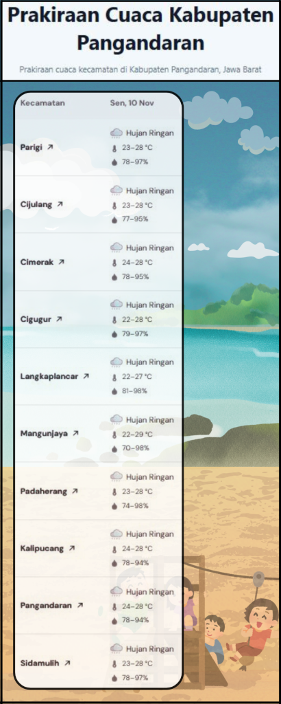 LAPORAN HARIAN PUSDALOPS PB KAB. PANGANDARAN BADAN PENANGGULANGAN BENCANA DAERAH KAB. PANGANDARAN A. Waktu : Senin, 10 November 2025 Pukul 06.00 WIB. B. Kejadian Bencana : – NIHIL C. Prakiraan Cuaca : Pagi : Berawan Siang : Hujan Ringan – Berawan Malam : Berawan Dini Hari : Hujan Ringan – Berawan Suhu […]