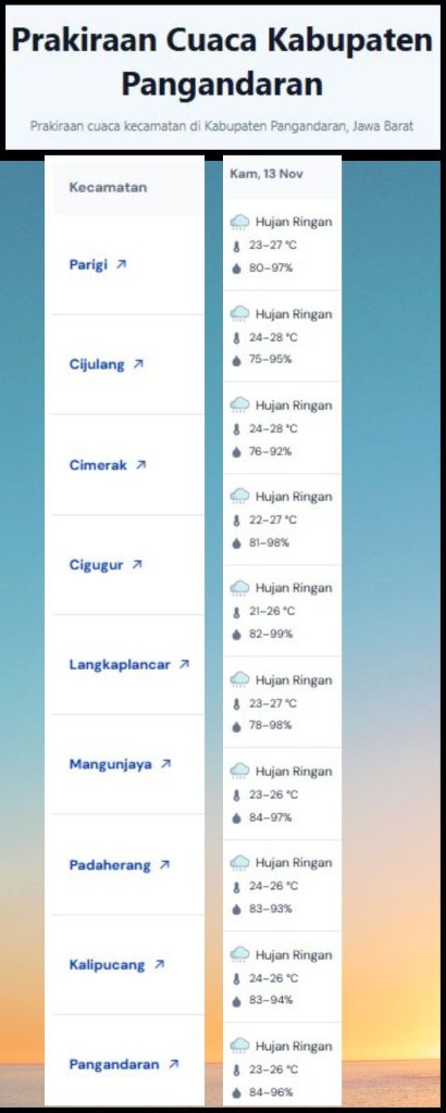 LAPORAN HARIAN PUSDALOPS PB KAB. PANGANDARAN BADAN PENANGGULANGAN BENCANA DAERAH KAB. PANGANDARAN A. Waktu : Kamis, 13 November 2025 Pukul 06.00 WIB. B. Kejadian Bencana : – NIHIL C. Prakiraan Cuaca : Pagi : Berawan Siang : Hujan Ringan – Berawan Malam : Berawan Dini Hari : Hujan Ringan – Berawan Suhu : 23°C – […]
