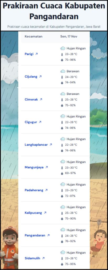 LAPORAN HARIAN PUSDALOPS PB KAB. PANGANDARAN BADAN PENANGGULANGAN BENCANA DAERAH KAB. PANGANDARAN A. Waktu : Senin, 17 November 2025 Pukul 06.00 WIB. B. Kejadian Bencana : NIHIL C. prakiraan Cuaca : Pagi : Berawan Siang : Hujan Ringan – Berawan Malam : Berawan Dini Hari : Hujan Ringan – Berawan Suhu : 22°C – 28°C […]