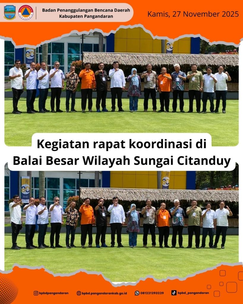 Kepala Pelaksana BPBD Kab. Pangandaran H. Dodo Kusnadi, SP, menghadiri Rapat Koordinasi di Balai Besar Wilayah Sungai Citanduy (27 November 2025) sebagai tindak lanjut atas laporan meningkatnya intensitas curah hujan serta naiknya debit Sungai Citanduy. Rapat kordinasi ini digelar untuk memperkuat koordinasi lintas sektor guna mengantisipasi potensi banjir dan memastikan langkah penanganan yang cepat, […]