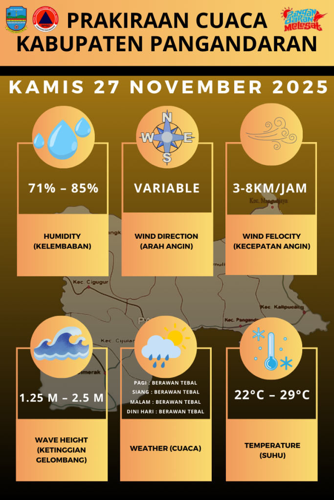 LAPORAN HARIAN PUSDALOPS PB KAB. PANGANDARAN BADAN PENANGGULANGAN BENCANA DAERAH KAB. PANGANDARAN A. Waktu : Kamis, 27 November 2025. Pukul 06.00 WIB. B. Kejadian Bencana : NIHIL C. Prakiraan Cuaca : Pagi : Berawan Tebal Siang : Berawan Tebal Malam : Berawan Tebal Dini Hari : Berawan Tebal Suhu : 22°C – 29°C Kelembaban : […]