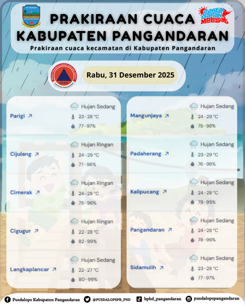 LAPORAN HARIAN PUSDALOPS PB KAB. PANGANDARAN BADAN PENANGGULANGAN BENCANA DAERAH KAB. PANGANDARAN A. Waktu : Rabu, 31 Desember 2025 Pukul 06.38 WIB. B. Kejadian Bencana : NIHIL C. Prakiraan Cuaca : Pagi : Berawan – Hujan Ringan Siang : Hujan Ringan Malam : Berawan Dini Hari : Berawan Suhu : 24°C – […]