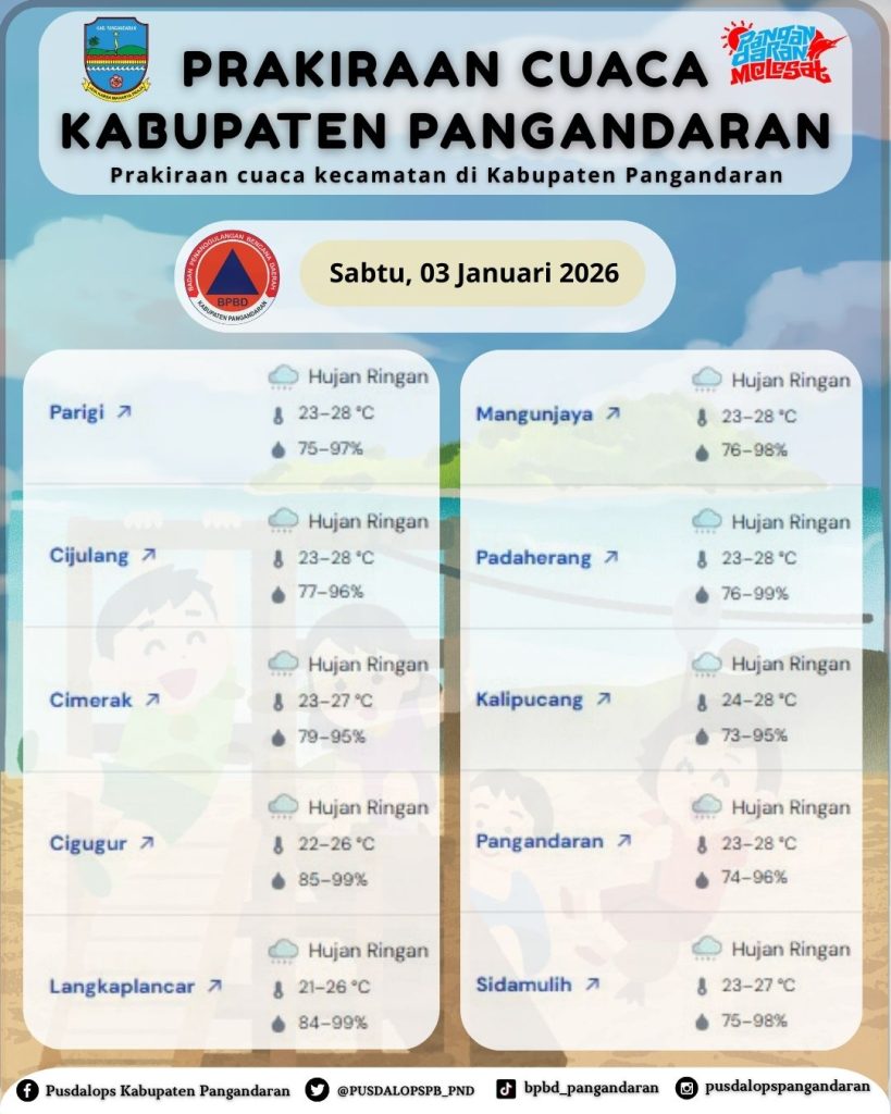LAPORAN HARIAN PUSDALOPS PB KAB. PANGANDARAN BADAN PENANGGULANGAN BENCANA DAERAH KAB. PANGANDARAN A. Waktu : Sabtu, 03 Januari 2026 Pukul 06.05 WIB. B. Kejadian Bencana : NIHIL C. Prakiraan Cuaca : Pagi : Berawan – Hujan Ringan Siang : Hujan Ringan Malam : Hujan Ringan Dini Hari : Berawan Suhu : 22°C […]