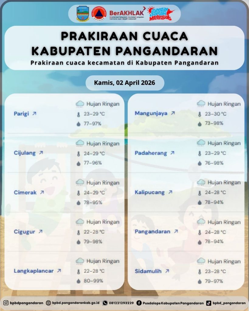 LAPORAN HARIAN PUSDALOPS PB KAB. PANGANDARAN BADAN PENANGGULANGAN BENCANA DAERAH KAB. PANGANDARAN A. Waktu : Kamis, 02 April 2026. Pukul : 06.00 WIB. B. Kejadian Bencana : NIHIL C. Prakiraan Cuaca : – Parigi : Hujan Ringan 🌡️ 23–29 °C 💧 77–97% – Cijulang : Hujan Ringan 🌡️ 24–29 °C 💧 77–96% […]