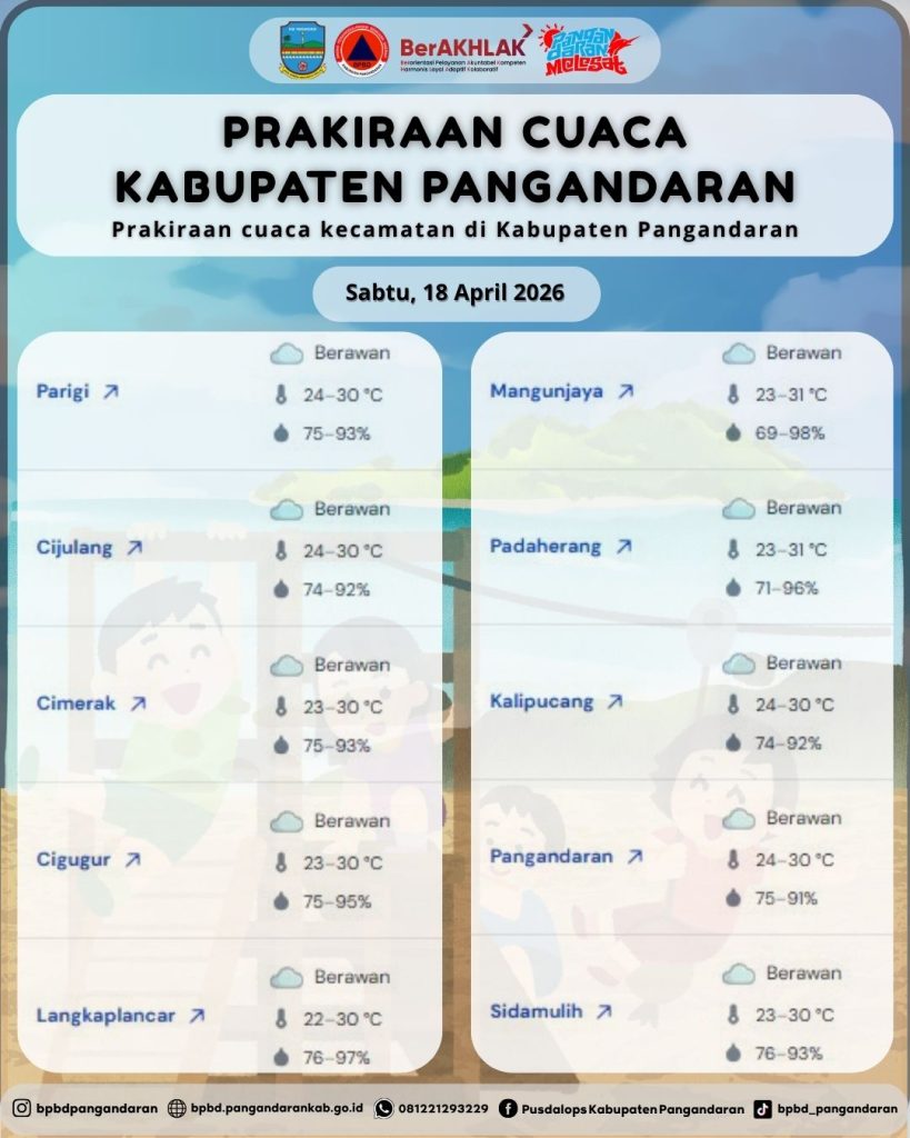 LAPORAN HARIAN PUSDALOPS PB KAB. PANGANDARAN BADAN PENANGGULANGAN BENCANA DAERAH KAB. PANGANDARAN A. Waktu : Sabtu, 18 April 2026 Pukul 06.20 WIB. B. Kejadian Bencana : NIHIL C. Prakiraan Cuaca : – Parigi: Berawan, 🌡️24–30°C, 💧75–93% – Cijulang: Berawan, 🌡️24–30°C, 💧74–92% – Cimerak: Berawan, 🌡️23–30°C, 💧75–93% – Cigugur: Berawan, 🌡️23–30°C, 💧76–97% – […]