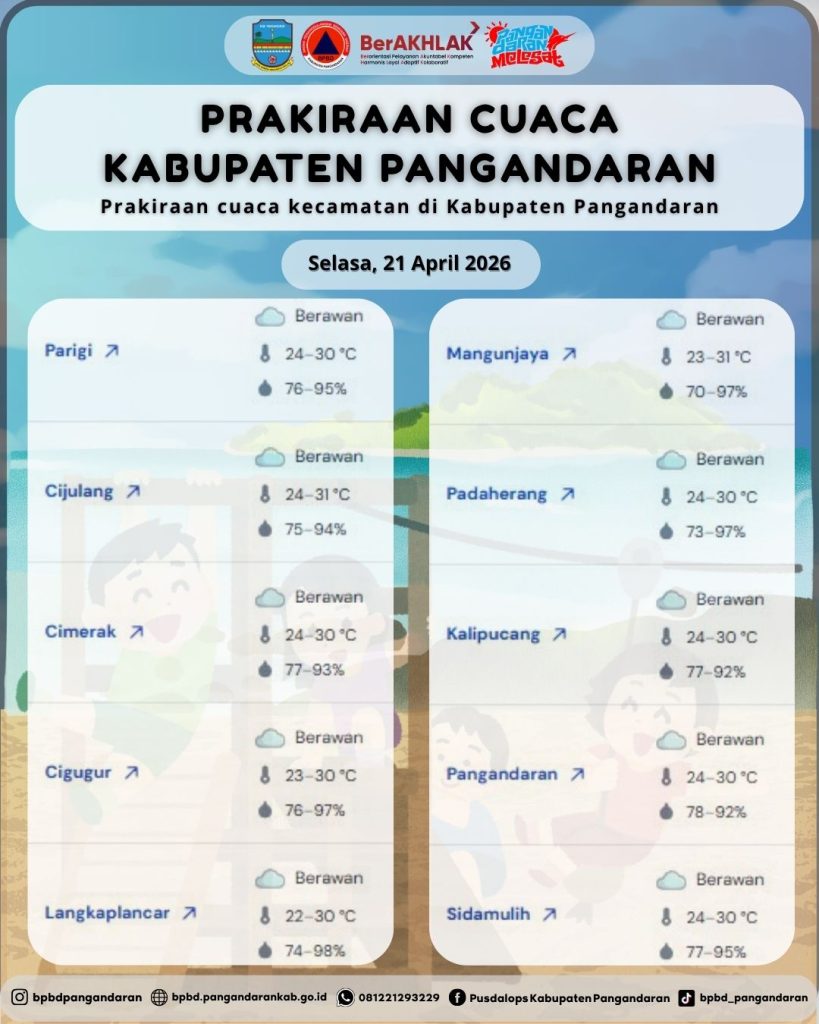 LAPORAN HARIAN PUSDALOPS PB KAB. PANGANDARAN BADAN PENANGGULANGAN BENCANA DAERAH KAB. PANGANDARAN A. Waktu : Selasa, 21 April 2026 Pukul 06.00 WIB. B. Kejadian Bencana : NIHIL C. Prakiraan Cuaca : – Parigi: Berawan, 🌡️24–30°C, 💧76–95% – Cijulang: Berawan, 🌡️24–31°C, 💧75–94% – Cimerak: Berawan, 🌡️24–30°C, 💧77–93% – Cigugur: Berawan, 🌡️23–30°C, 💧76–97% – […]