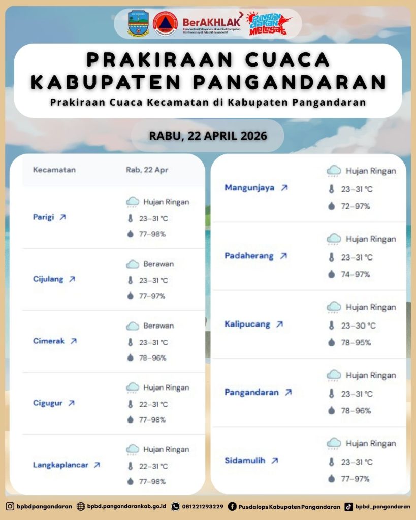 LAPORAN HARIAN PUSDALOPS PB BADAN PENANGGULANGAN BENCANA DAERAH KABUPATEN PANGANDARAN A. Waktu : Rabu, 22 April 2026. Pukul : 06.00 WIB. B. Kejadian Bencana : NIHIL C. Prakiraan Cuaca : – Parigi : Hujan Ringan 🌡️ 23 – 31 °C, 💧77 – 98% – Cijulang : Berawan 🌡️ 23 – 31 °C, 💧77 – 97% […]