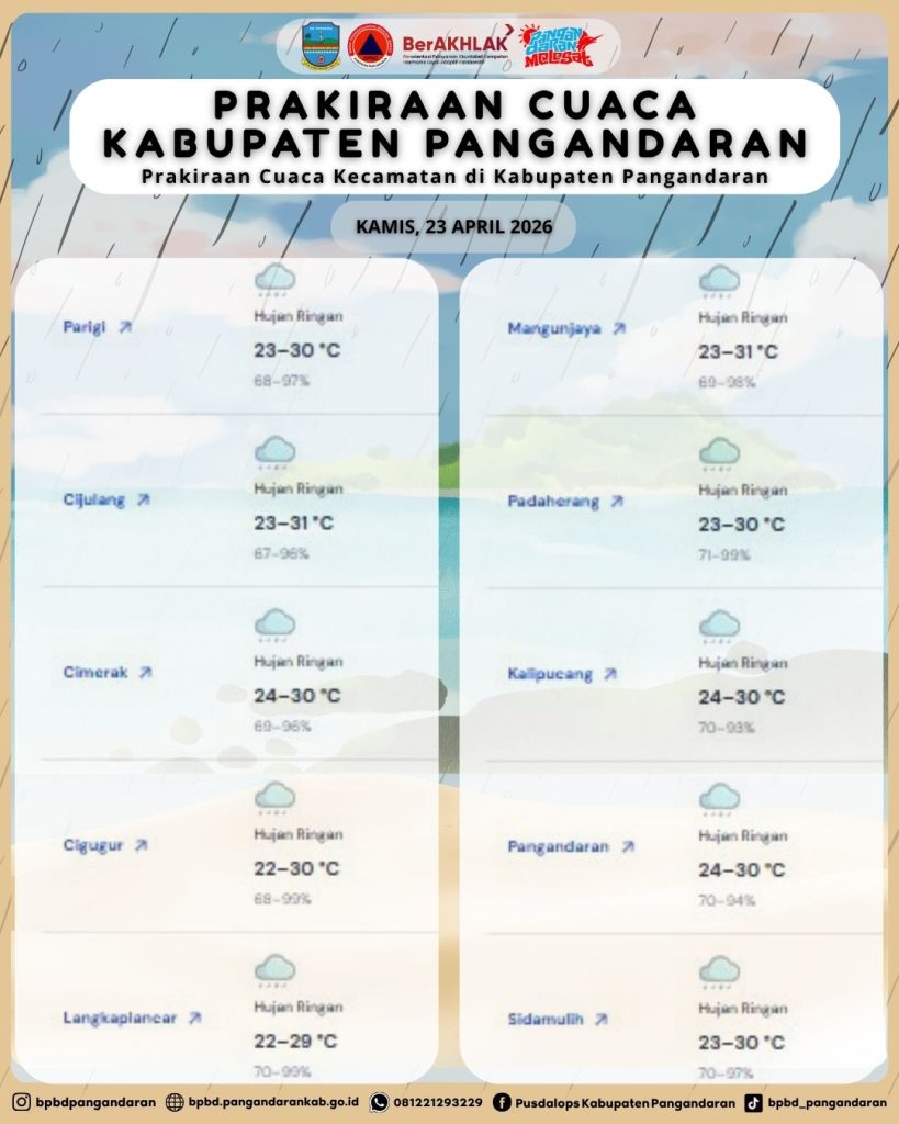 LAPORAN HARIAN PUSDALOPS PB KAB. PANGANDARAN BADAN PENANGGULANGAN BENCANA DAERAH KAB. PANGANDARAN A. Waktu : Kamis, 23 April 2026. Pukul : 06.09 WIB. B. Kejadian Bencana : NIHIL C. Prakiraan Cuaca : – Parigi : Hujan Ringan 🌡️ 23–30 °C 💧 68–97% – Cijulang : Hujan Ringan 🌡️ 23–31 °C 💧67–96% – […]