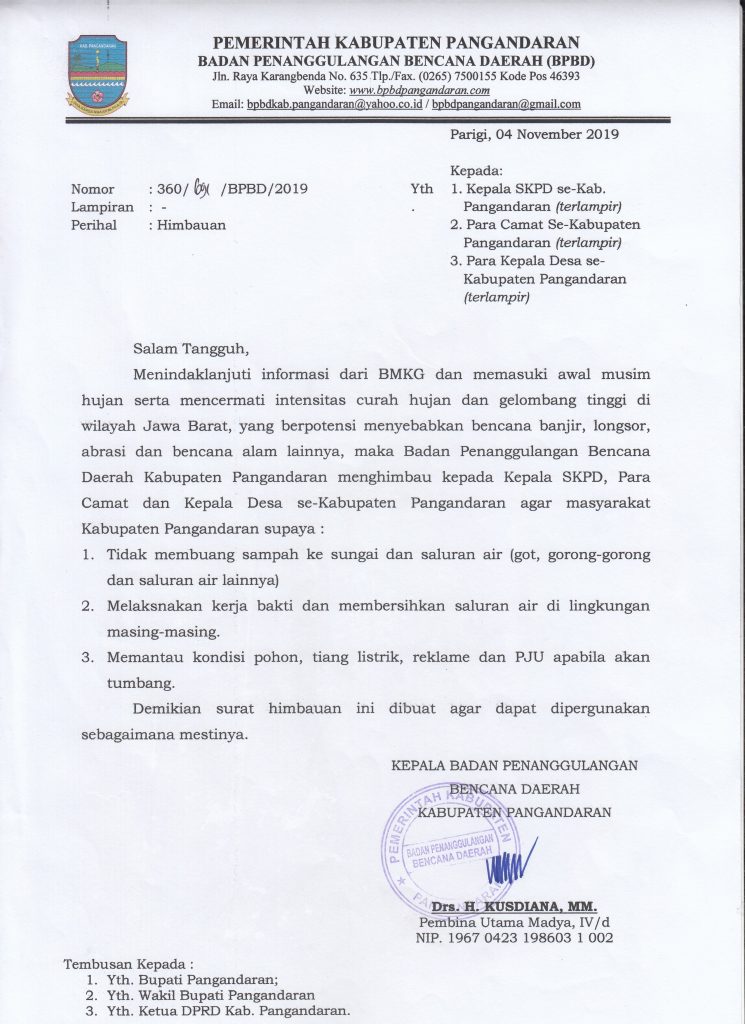 Surat Himbauan Dari BPBD Pangadaran Memasuki Musim Penghujan
