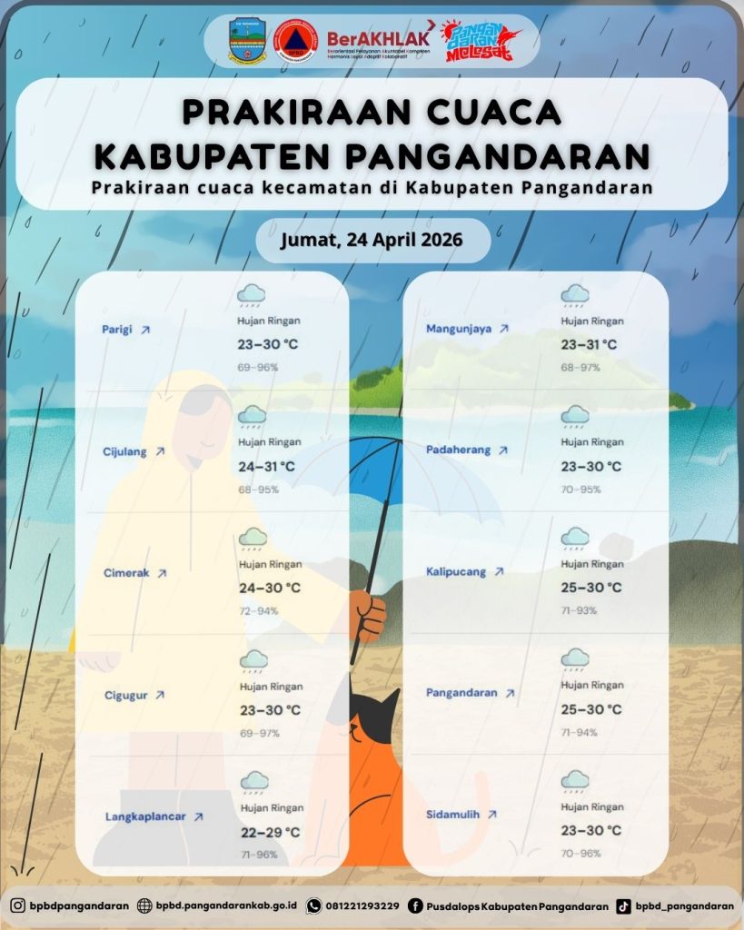 LAPORAN HARIAN PUSDALOPS PB KAB. PANGANDARAN BADAN PENANGGULANGAN BENCANA DAERAH KAB. PANGANDARAN A. Waktu : Jumat, 24 April 2026 Pukul 06.00 WIB. B. Kejadian Bencana : NIHIL C. Prakiraan Cuaca : – Parigi: Berawan, π‘οΈ23β30Β°C, π§69β96% – Cijulang: Berawan, π‘οΈ24β31Β°C, π§68β95% – Cimerak: Berawan, π‘οΈ24β30Β°C, π§72β94% – Cigugur: Berawan, π‘οΈ23β30Β°C, π§69β97% – […]