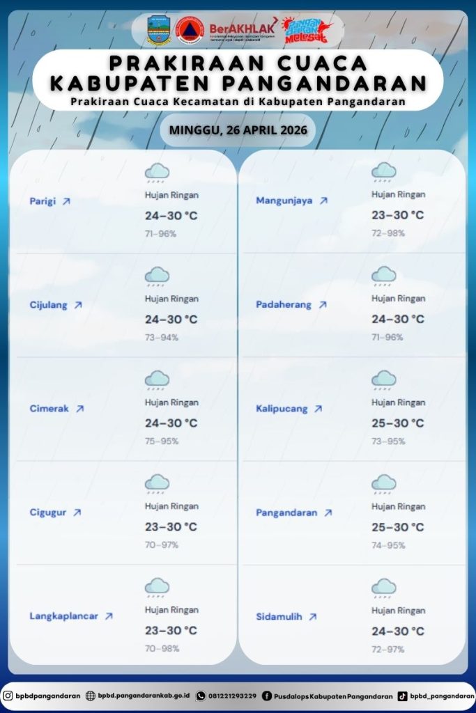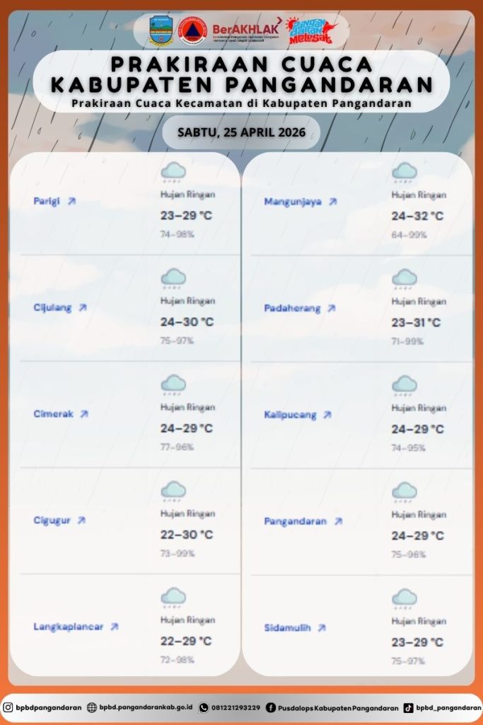 LAPORAN HARIAN PUSDALOPS PB BADAN PENANGGULANGAN BENCANA DAERAH KABUPATEN PANGANDARAN A. Waktu : Sabtu, 25 April 2026. Pukul : 06.00 WIB. B. Kejadian Bencana : NIHIL C. Prakiraan Cuaca : β’ Parigi :Β Hujan Ringan π‘οΈ 23 β 31 Β°C π§77 β 98% β’ Cijulang : Hujan Ringan π‘οΈ 23 β 31 Β°C, π§77 β 97% […]