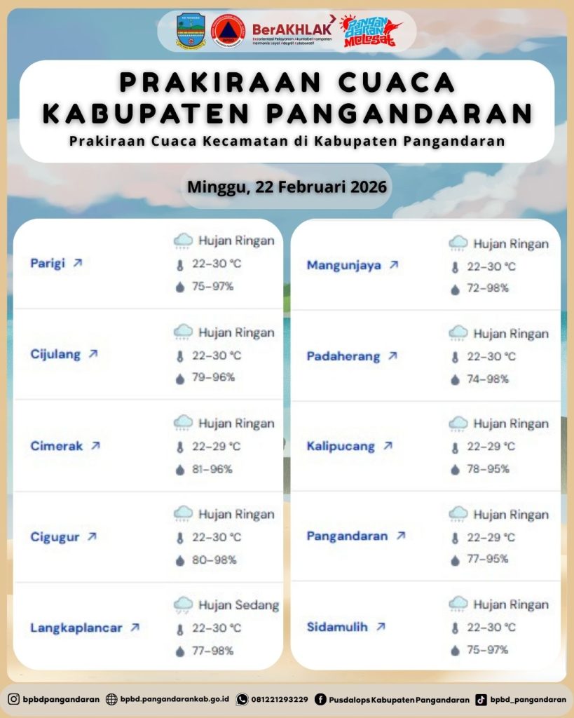 LAPORAN HARIAN PUSDALOPS PB KAB. PANGANDARAN BADAN PENANGGULANGAN BENCANA DAERAH KAB. PANGANDARAN A. Waktu : Minggu, 22 Februari 2026. Pukul : 06.48 WIB. B. Kejadian Bencana : NIHIL C. Prakiraan Cuaca : – Parigi : Hujan Ringan, 🌡️ 22–30 °C, 💧 75–97% – Cijulang : Hujan Ringan, 🌡️ 22–30 °C, 💧 79–96% – Cimerak : […]