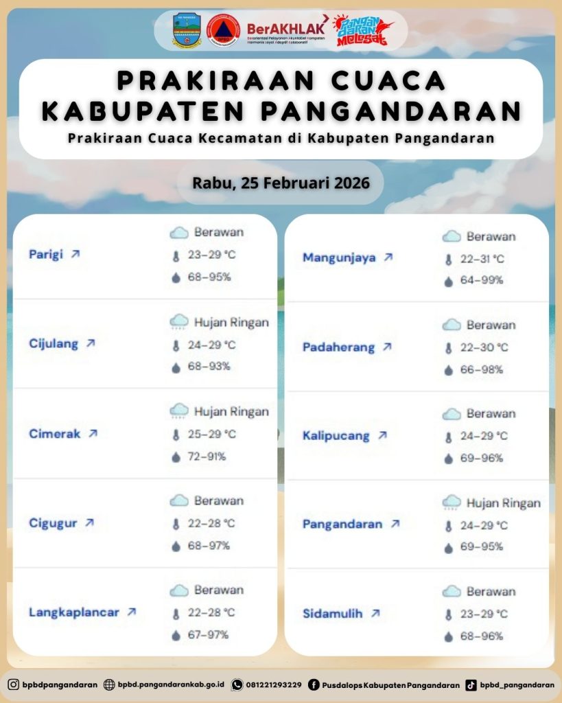 LAPORAN HARIAN PUSDALOPS PB KAB. PANGANDARAN BADAN PENANGGULANGAN BENCANA DAERAH KAB. PANGANDARAN A. Waktu : Rabu, 25 Februari 2026. Pukul : 06.28 WIB. B. Kejadian Bencana : NIHIL C. Prakiraan Cuaca : – Parigi : Berawan, 🌡️23–29 °C, 💧68–95% – Cijulang : Hujan Ringan, 🌡️ 24–29 °C, 💧68–93% – Cimerak : Hujan Ringan, 🌡️ 25–29 […]
