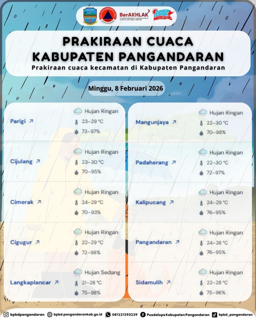 LAPORAN HARIAN PUSDALOPS PB KAB. PANGANDARAN BADAN PENANGGULANGAN BENCANA DAERAH KAB. PANGANDARAN A. Waktu : Sabtu, 07 Februari 2026. Pukul : 07.25 WIB. B. Kejadian Bencana : NIHIL C. Prakiraan Cuaca : – Parigi : Hujan Ringan, 🌡️23–30 °C, 💧74–97% – Cijulang : Berawan, 🌡️23–30 °C, 💧72–95% – Cimerak : Berawan, 🌡️23–29 °C, 💧74–95% […]