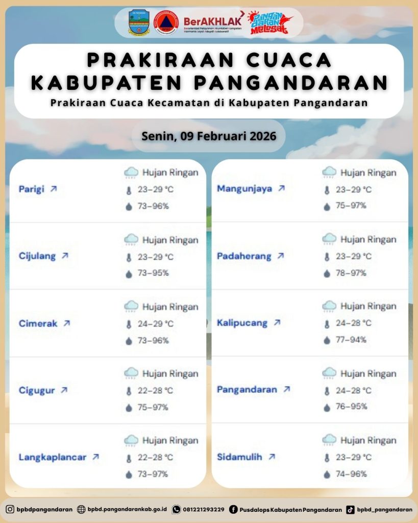 LAPORAN HARIAN PUSDALOPS PB BADAN PENANGGULANGAN BENCANA DAERAH KABUPATEN PANGANDARAN A. Waktu : Senin, 09 Februari 2026. Pukul : 06.00 WIB. B. Kejadian Bencana : NIHIL C. Prakiraan Cuaca : – Parigi : Hujan Ringan 🌡️ 23 – 29 °C, 💧73 – 96% – Cijulang : Hujan Ringan 🌡️ 23 – 29 °C, 💧73 – […]