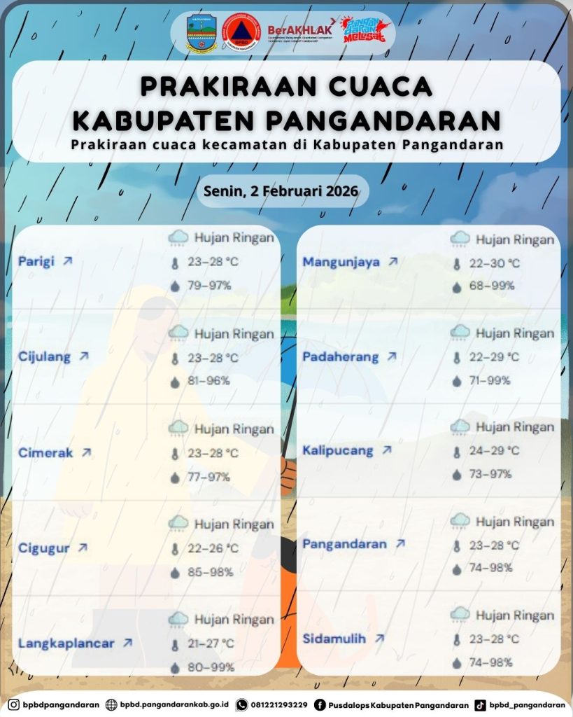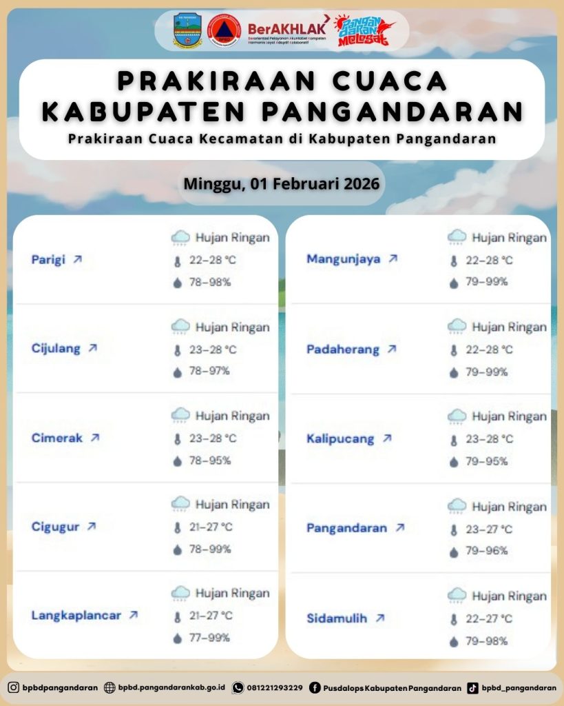 LAPORAN HARIAN PUSDALOPS PB KAB. PANGANDARAN BADAN PENANGGULANGAN BENCANA DAERAH KAB. PANGANDARAN A. Waktu : Minggu, 01 Februari 2026. Pukul : 07.35 WIB. B. Kejadian Bencana : NIHIL C. prakiraan Cuaca : – Parigi : Hujan Ringan, 🌡️22–28 °C, 💧78–98% – Cijulang : Hujan Ringan, 🌡️23–28 °C, 💧78–97% – Cimerak : Hujan Ringan, 🌡️23–28 °C, […]