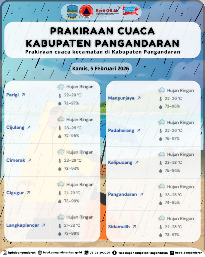 LAPORAN HARIAN PUSDALOPS PB KAB. PANGANDARAN BADAN PENANGGULANGAN BENCANA DAERAH KAB. PANGANDARAN A. Waktu : Kamis, 5 Februari 2026 Pukul 06.05 WIB. B. Kejadian Bencana : NIHIL C. Prakiraan Cuaca : – Parigi: Hujan Ringan, 🌡️22–29°C, 💧72–97% – Cijulang: Hujan Ringan, 🌡️23–29°C, 💧72–94% – Cimerak: Hujan Ringan, 🌡️23–29°C, 💧73–94% – Cigugur: Hujan […]
