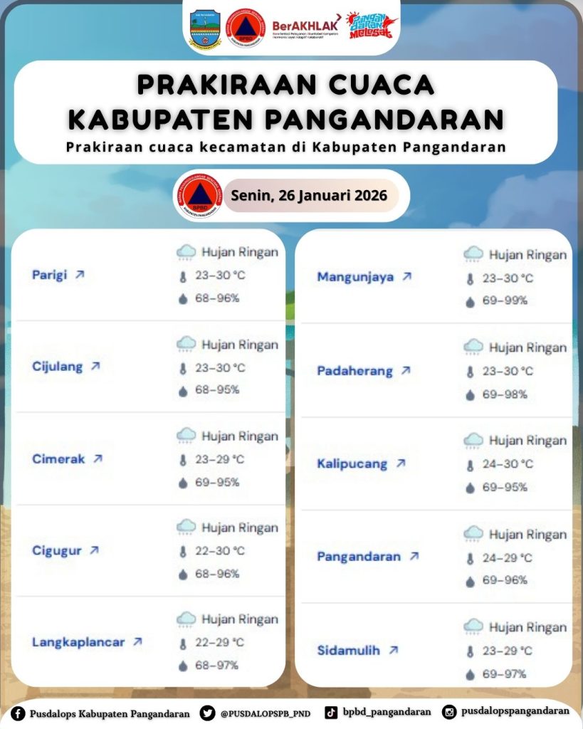LAPORAN HARIAN PUSDALOPS PB KAB. PANGANDARAN BADAN PENANGGULANGAN BENCANA DAERAH KAB. PANGANDARAN A. Waktu : Senin, 26 Januari 2026. Pukul : 06.10 WIB. B. Kejadian Bencana : NIHIL C. prakiraan Cuaca : – Parigi : Hujan Ringan, 🌡️23–30 °C, 💧68–96% – Cijulang : Hujan Ringan, 🌡️23–30 °C, 💧68–95% – Cimerak : Hujan Ringan, 🌡️23–29 °C, […]