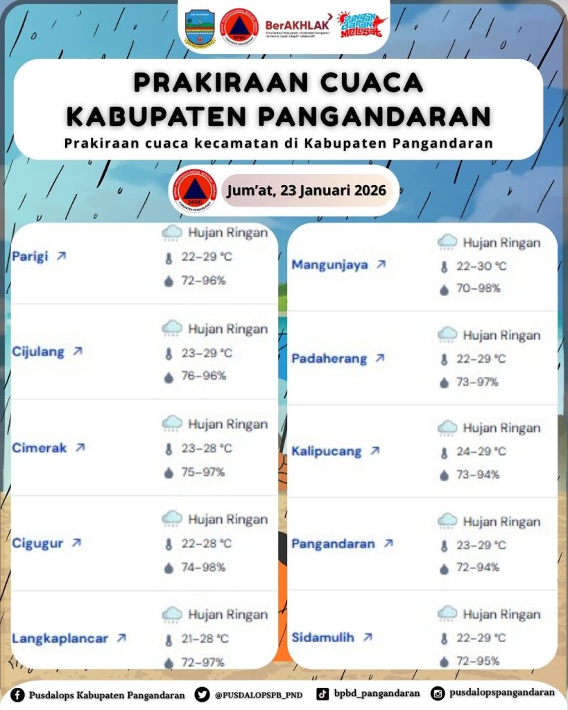LAPORAN HARIAN PUSDALOPS PB KAB. PANGANDARAN BADAN PENANGGULANGAN BENCANA DAERAH KAB. PANGANDARAN A. Waktu : Jum’at, 23 Januari 2026. Pukul : 06.13 WIB. B. Kejadian Bencana : NIHIL C. prakiraan Cuaca : – Parigi : Hujan Ringan, 🌡️22–29 °C, 💧72–96% – Cijulang : Hujan Ringan, 🌡️23–29 °C, 💧76–96% – Cimerak : Hujan […]