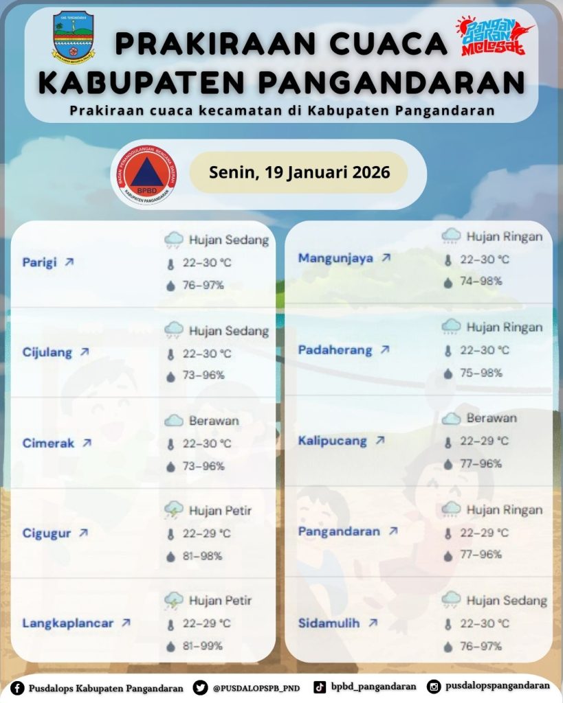 LAPORAN HARIAN PUSDALOPS PB KAB. PANGANDARAN BADAN PENANGGULANGAN BENCANA DAERAH KAB. PANGANDARAN A. Waktu : Selasa, 20 Januari 2026. Pukul : 06.28 WIB. B. Kejadian Bencana : NIHIL C. prakiraan Cuaca : – Parigi : Hujan Ringan, 🌡️22–28 °C, 💧77–98% – Cijulang : Hujan Ringan, 🌡️22–29 °C, 💧78–97% – Cimerak : Hujan Ringan, 🌡️22–29 °C, […]