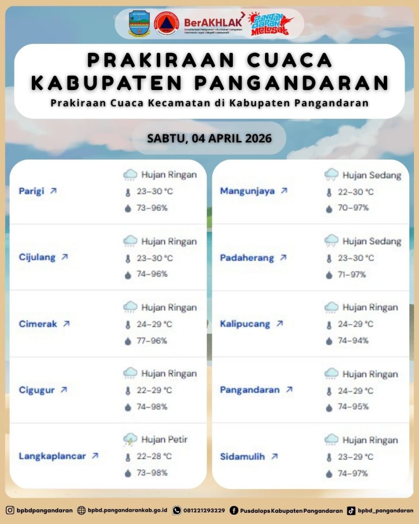 LAPORAN HARIAN PUSDALOPS PB BADAN PENANGGULANGAN BENCANA DAERAH KABUPATEN PANGANDARAN A. Waktu : Sabtu, 04 April 2026. Pukul : 06.00 WIB. B. Kejadian Bencana : NIHIL C. Prakiraan Cuaca : – Parigi : Hujan Ringan 🌡️ 23 – 30 °C, 💧73 – 96% – Cijulang : Hujan Ringan 🌡️ 23 – 30 °C, […]