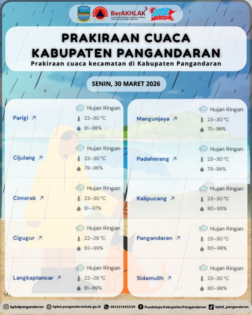 LAPORAN HARIAN PUSDALOPS PB KAB. PANGANDARAN BADAN PENANGGULANGAN BENCANA DAERAH KAB. PANGANDARAN A. Waktu : Selasa, 31 Maret 2026 Pukul 06.00 WIB. B. Kejadian Bencana : NIHIL C. Prakiraan Cuaca : – Parigi: Berawan, 🌡️24–29°C, 💧71–95% – Cijulang: Berawan, 🌡️25–29°C, 💧71–92% – Cimerak: Berawan, 🌡️25–29°C, 💧73–91% – Cigugur: Hujan Ringan, 🌡️23–29°C, 💧71–96% […]
