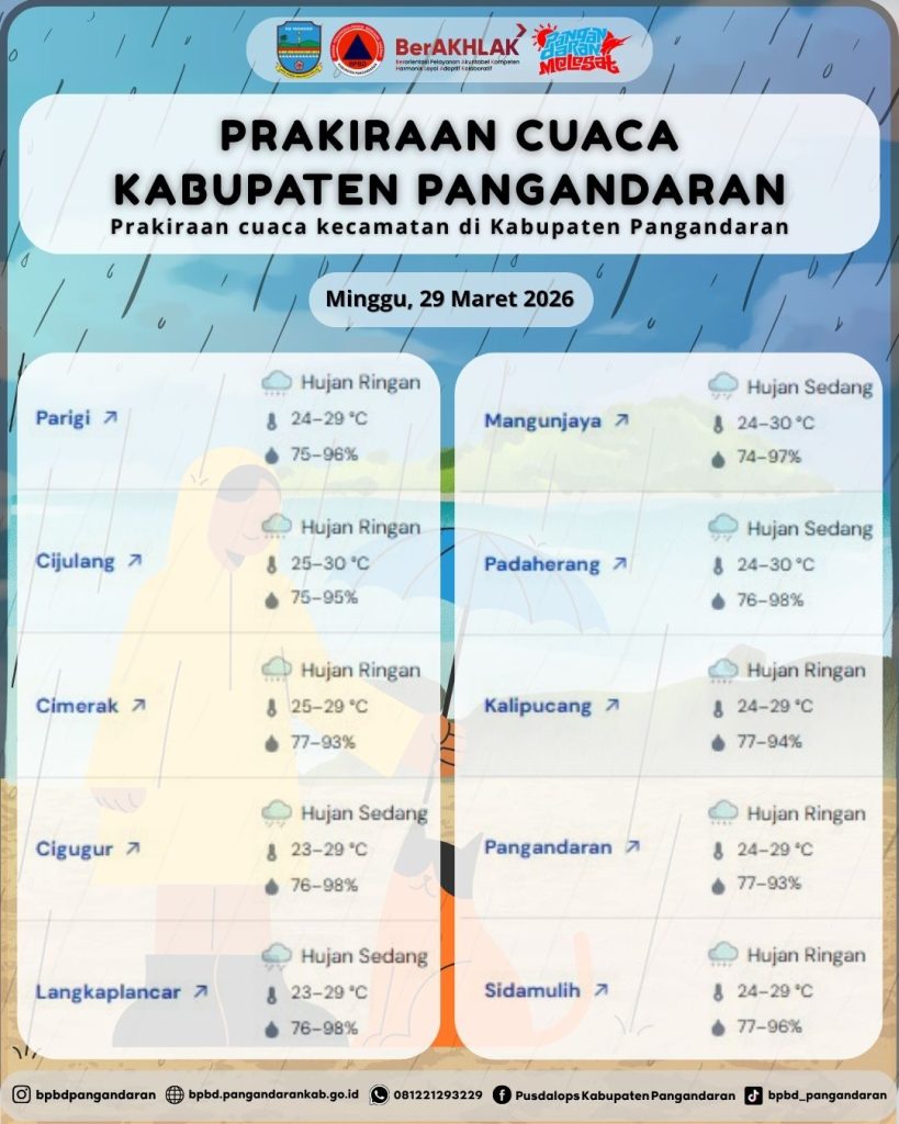 LAPORAN HARIAN PUSDALOPS PB BADAN PENANGGULANGAN BENCANA DAERAH KABUPATEN PANGANDARAN A. Waktu : Minggu, 29 Maret 2026. Pukul : 06.48 WIB. B. Kejadian Bencana : NIHIL C. Prakiraan Cuaca : – Parigi : Hujan Ringan 🌡️ 24 – 29 °C, 💧75 – 96% – Cijulang : Hujan Ringan 🌡️ 25 – 30 […]